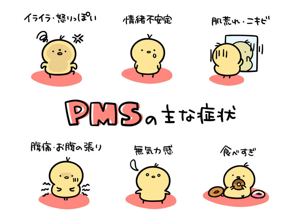 イライラする、怒りっぽくなる、肌荒れ、ニキビが出る、のぼせる、お腹(下腹部)が張る、お腹が痛くなる、腰が痛い、頭痛、身体が重い、胸が張る・痛い、落ち着かない、気分が落ち込む、泣きたくなる、ぼーっとするよく食べるようになる、食欲がなくなるなどがあるよ。