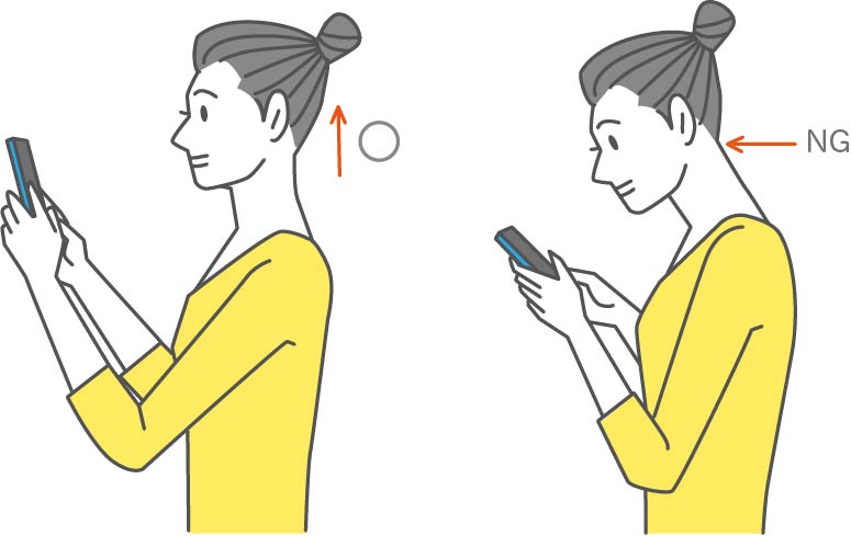 次に、スマホを見るときは、首を前に出すようにしてスマホを見るといいよ。下向きばかりではなく、たまに上を向いたり、首筋や肩を動かすのもオススメ。